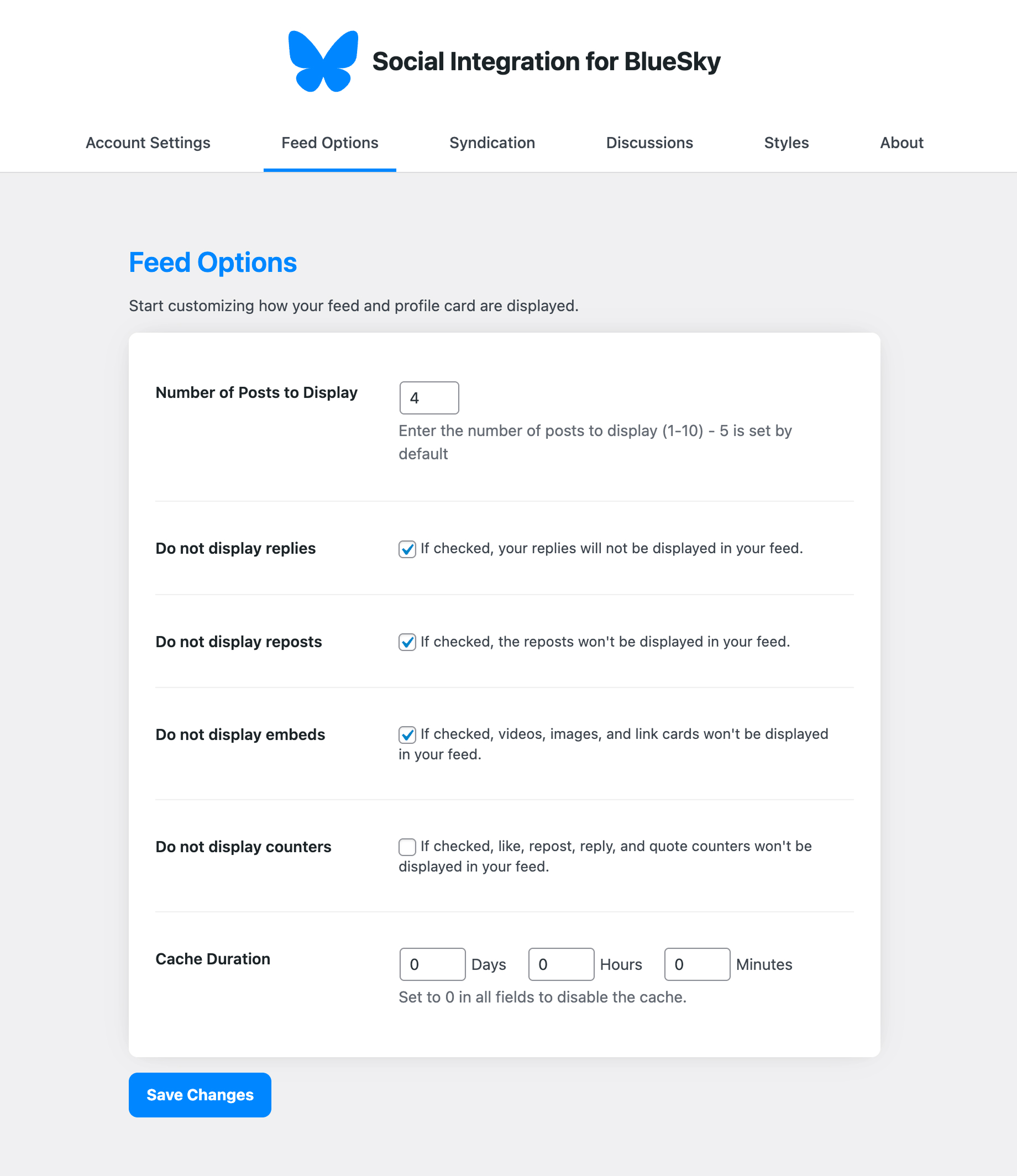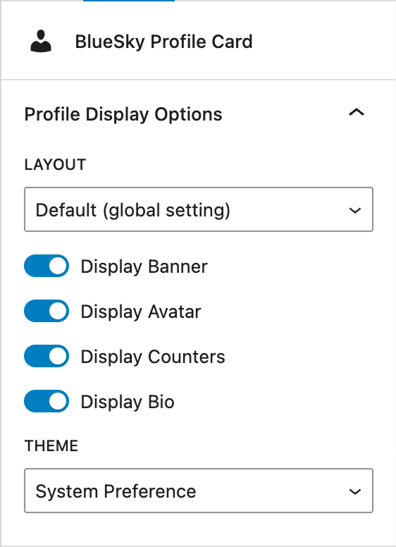 You have some options available like multiple ways to display your profile card and posts, the number of posts to display, whether to display embedded records or not, and the theme of the profile card and posts. You have some options available like multiple ways to display your profile card and posts, the number of posts to display, whether to display embedded records or not, and the theme of the profile card and posts. Since version 2.0.0 you can also set up multiple accounts, auto-syndication with category matching, and add the BlueSky discussion near your comment area.