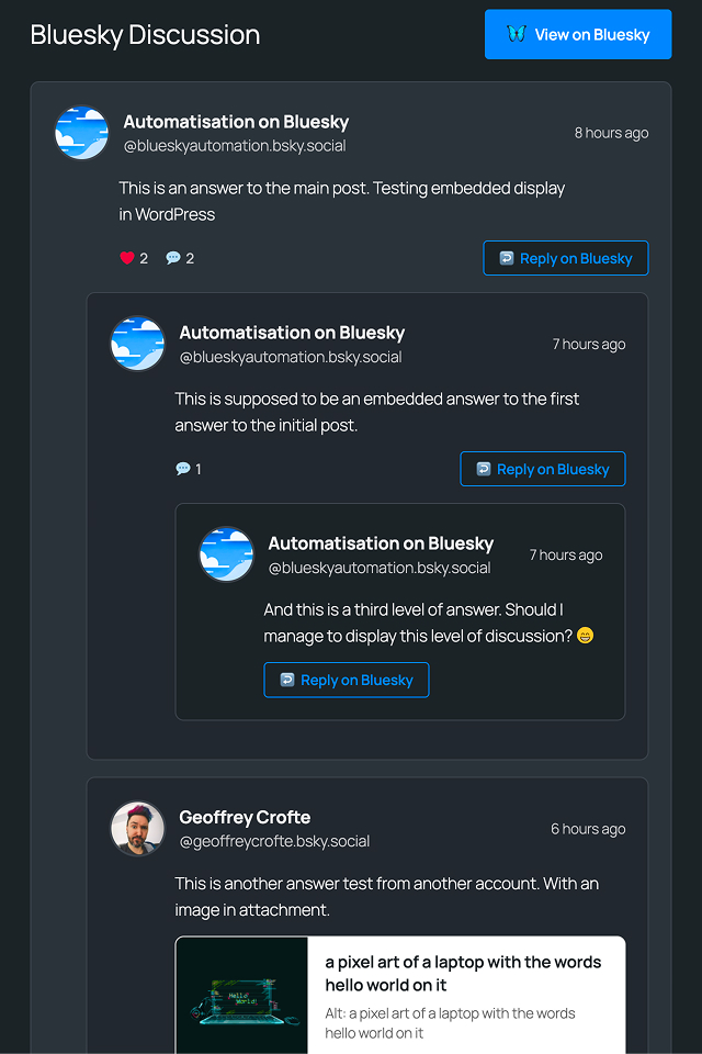 - Added the ability to display BlueSky discussion for syndicated posts below your blog posts, including options like the depth of the answers, their display, the image content, the counters, etc. (see