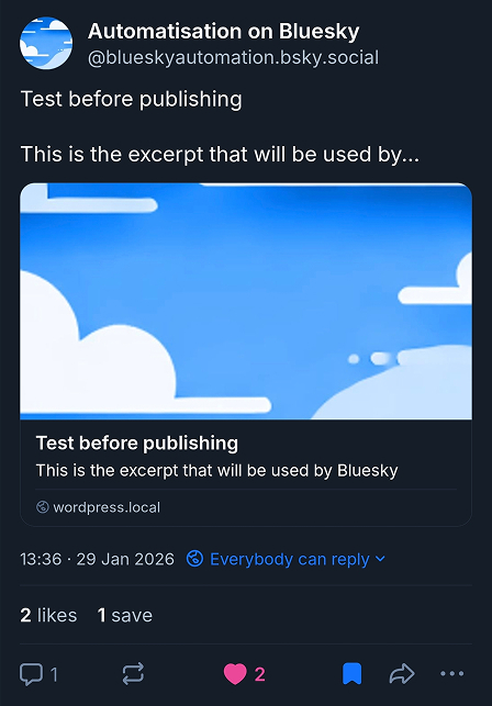 An option is available for the syndication of your posts for BlueSky Social. This syndication allows you to display BlueSky discussions directly in the comment section of your WordPress posts. (it's an option)